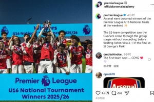 体育资讯11月11日讯 英超官方宣布,阿森纳U16梯队在上周末问鼎英超U16全国锦标赛冠军。