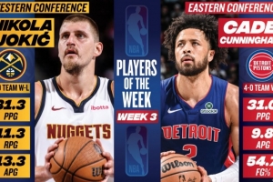 体育资讯11月11日讯 今日NBA官方宣布,活塞球星康宁汉姆和掘金球星约基奇当选本赛季第3周东、西部最佳球员。