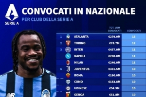 体育资讯11月12日讯 德国转会市场统计了意甲各队被国家队征召球员的数量,并列出榜单,亚特兰大13人居首,都灵12人次席。