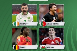 体育资讯11月19日讯 欧洲世预赛最后一轮比赛战罢,欧足联官方公布了本轮最佳球员候选名单。