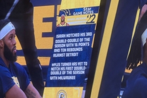 比赛首节主场展示以赛亚-杰克逊数据写道:“以赛亚·杰克逊在对阵活塞时砍下16分10篮板,拿到赛季第三次两双,迈尔斯·特纳在雄鹿还没拿过两双。”