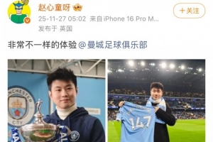 赵心童在社媒写道:“非常不一样的体验。@曼城足球俱乐部”