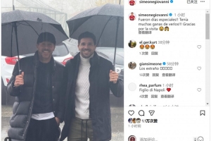 西蒙尼看望自己的儿子吉奥瓦尼·西蒙尼,后者社媒晒出父子合照,配文:“这真是无比特别的时光,我一直都渴望与你们相见,感谢你们的到访。”