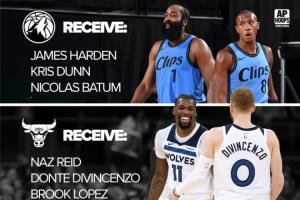 森林狼得到:哈登、克里斯·邓恩、巴图姆;