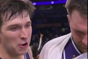 赛后东契奇接受采访时里夫斯抢镜:“我现在扣篮次数比他多。”