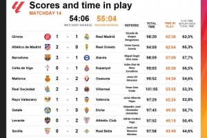 体育资讯12月2日讯 数据显示,赫罗纳1-1皇马是第14轮西甲净时间最长的比赛。