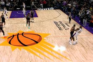 比赛最后时刻,狄龙飚中三分后不满被詹姆斯扑倒,起身与詹姆斯对撞吃T,累积两T被驱逐。
