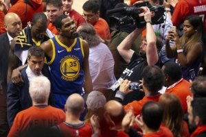 杜兰特回忆道:“我记得当时两场比赛之间大概有两天时间,所以我基本上24小时不间断地在接受治疗,我甚至要跑到多伦多城外大概45分钟车程的地方,去做那种水下跑步机的训练。总之,我尽了一切努力去恢复,我想回来打球,我开始感觉好一些了,然后在比赛前一天,我和队友们打了三对三的训练。”