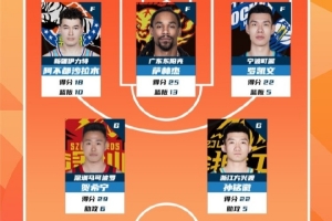2025-2026赛季CBA联赛常规赛第8轮结束较量,来自新疆广汇篮球俱乐部的阿不都沙拉木 ,广东宏远篮球俱乐部的萨林杰,宁波富邦町渥男篮的罗凯文,深圳新世纪烈豹篮球俱乐部的贺希宁和浙江广厦篮球俱乐部的孙铭徽入选CBA联赛常规赛第8轮最佳阵容!