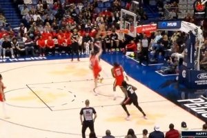 杀疯了!拉拉维亚接詹姆斯传球晃开防守 滑翔满弓战斧炸裂劈扣