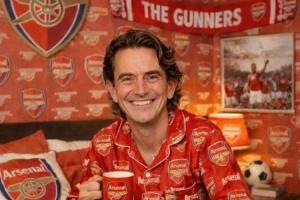 著名阿森纳球迷,英国主持人皮尔斯·摩根在社媒晒出一张合成图片,照片中弗兰克全身都是阿森纳logo,就连墙壁和床铺都是阿森纳元素。