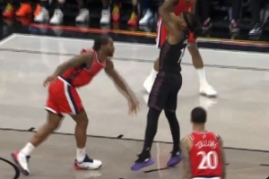 全面压制!贾勒特·阿伦大帽拒绝兰德尔扣篮 反击力压兰德尔暴扣