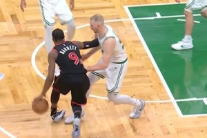 用力过猛!汤姆林跳球奋力一拨 将球打中自家篮筐