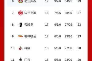 体育资讯01月18日讯 今日德甲第18轮,拜仁客场5-1莱比锡,最新积分榜如下: