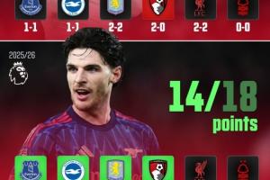 据AFTV统计,阿森纳近六轮英超拿到了18个积分中的14分,相比上赛季相同的六场比赛,多拿了9个积分。