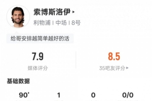 体育资讯1月22日讯 欧冠联赛阶段第7轮,利物浦3-0战胜马赛。索博斯洛伊首发出战,打进1粒进球,送出1次关键传球,还有3次解围,评分7.9。