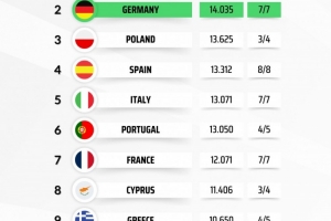 体育资讯1月23日讯 Football Rankings列出本赛季欧战积分排名,最终排名前两位的联赛将获得额外的欧冠席位。