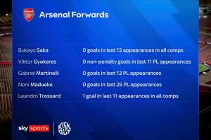 体育资讯01月27日讯 天空体育列出阿森纳的前锋数据,球队队内多人陷入进球荒。