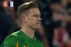 比赛的最后时刻,赫罗纳禁区内出现险情,特尔施特根近距离将球扑住,力保球队不被绝杀。