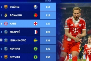 体育资讯1月29日讯 在本轮欧冠,拜仁2-1击败埃因霍温,凯恩破门得分,达成拜仁生涯直接参与150球里程碑。以下为自2000年代表单一俱乐部直接参与150球最快纪录榜,具体如下:
