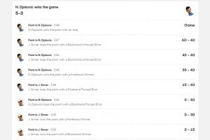 决胜盘第8局德约0-40后,连拿5分最终保发。5-3领先辛纳
