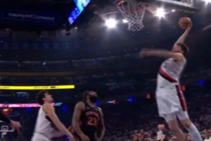完全不防守啊!杰明持球推进畅通无阻杀入篮下 上演滑翔劈扣