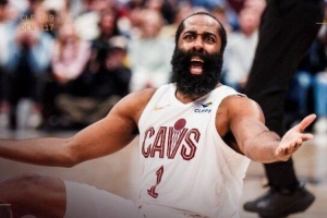 赛后,骑士官推发布赢球海报,封面直接是哈登坐在地上对裁判摊手的瞬间。