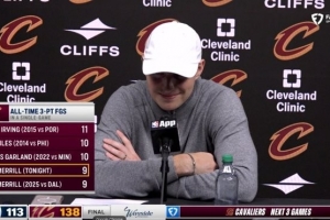 据统计,梅里尔单场9记三分,追平了自己保持的骑士队史单场第4高三分命中纪录,仅次于欧文(11记)、CJ·迈尔斯和加兰(10记)。