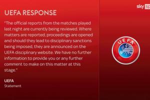 欧足联:“昨晚比赛的相关官方报告目前正在审查中。若有相关事件被上报,将启动相应程序;如最终作出纪律处罚,相关结果会在欧足联纪律官网公布。现阶段,我们无法向你提供更多信息,亦不会就此事项发表进一步评论。”