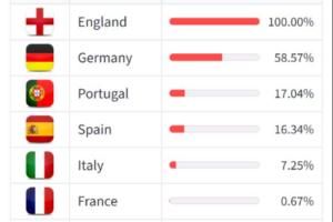 意大利则遭遇完全相反的走势,3场比赛全败,让他们整体概率暴跌20%,目前只有7%的概率。