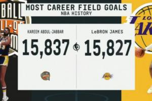湖人球星勒布朗·詹姆斯目前职业生涯进球数15827记,距离历史第一的贾巴尔仅差10记,有望在今日完成超越登顶历史第一。