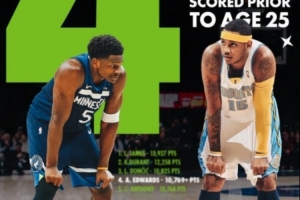 爱德华兹25岁前的总得分超越卡梅隆·安东尼,上升至NBA历史第四,仅次于詹姆斯、杜兰特和东契奇。