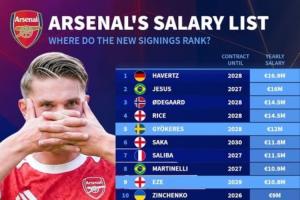体育资讯09月01日讯 德转列出了阿森纳球员的年薪排行,哈弗茨以1690万欧居首,今夏引进的约克雷斯和埃泽进入了球队前十。