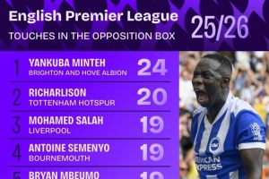 本赛季英超在对方禁区触球次数榜: