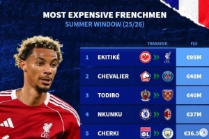 体育资讯9月8日讯 今夏主流联赛转会窗已经关闭,《转会市场》也列出了法国球员的今夏转会费最贵情况。