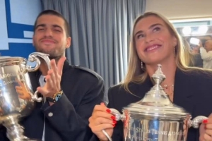 体育资讯9月9日讯 萨巴伦卡晒出和阿尔卡拉斯高举奖杯庆祝的视频。