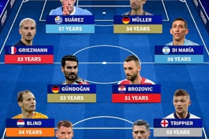 前锋:苏亚雷斯(乌拉圭,37岁)、穆勒(德国,34岁)