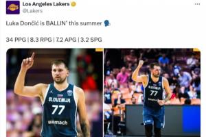 湖人官推今日晒出了一组东契奇欧锦赛的数据,并写道:“东契奇大杀四方。”
