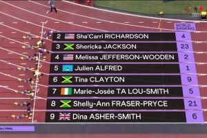 最后一次参加世锦赛女子飞人大战的牙买加传奇弗雷泽11秒03获得第六名。