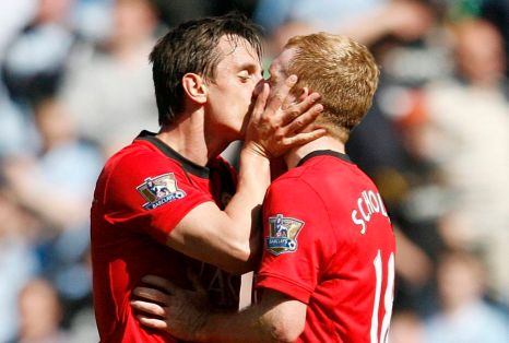 2010年4月,斯科尔斯在曼市德比最后时刻打入制胜球,帮助曼联1-0取胜。进球后,他和内维尔在场上亲吻,震惊全场。