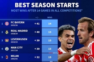 德转列五大联赛球队开局14场:拜仁全胜,皇马曼城米兰等队均13胜