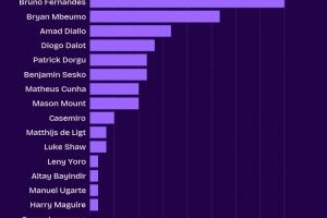 曼联队内英超创造机会榜:B费24次、姆伯莫16次、阿玛德10次