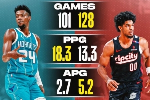 美媒Cluthpoints晒图,对比了2023年榜眼米勒和探花亨德森的数据,米勒出战101场,场均18.3分2.7助攻4.4篮板,命中率42.8%,亨德森出战128场,场均13.3分5.2助攻3.1篮板,命中率40.1%,并写道: