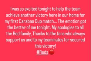 赛后,埃基蒂克在社媒向利物浦球迷道歉:“今晚能首次参加联赛杯主场赛事并帮助球队再夺胜利,我无比激动……但今夜情绪确实有些失控。在此向所有红军大家庭致歉,也感谢一直支持我们的球迷,以及携手赢下比赛的队友们!”