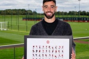 曼联官方社媒晒图,B费获得100球的纪念品,一个由100个B费卡通图案组成的纪念框。