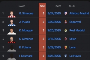 体育资讯9月25日讯 Stat Muse统计了五大联赛单场错失重大机会最多的球员,有六人单场错失3次重大机会,并列第一。