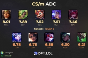 体育资讯10月1日讯 根据国外数据网站DPM.LOL统计,当前版本每分钟补刀数最高及最低的ADC: