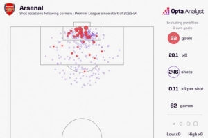 不包括乌龙球(因为没有预期进球值),阿森纳在这段时间里预期进球28.1的情况下攻入32球。仅看本赛季,阿森纳在英超中主罚了45个角球,比任何其他球队至少多4个,其中赖斯主罚了24个。这些角球产生了18次射门,其中有6次转化为进球。这意味着阿森纳在超过三分之一的角球进攻中都能形成射门,并且有三分之一的射门能够成功得分。
