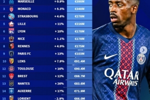 以下为法甲俱乐部身价排行情况: