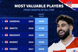 体育资讯10月13日讯 德国转会市场统计了克罗地亚球员的历史最高身价,并列出克罗地亚球员历史身价排名,格瓦迪奥尔8000万欧居首。